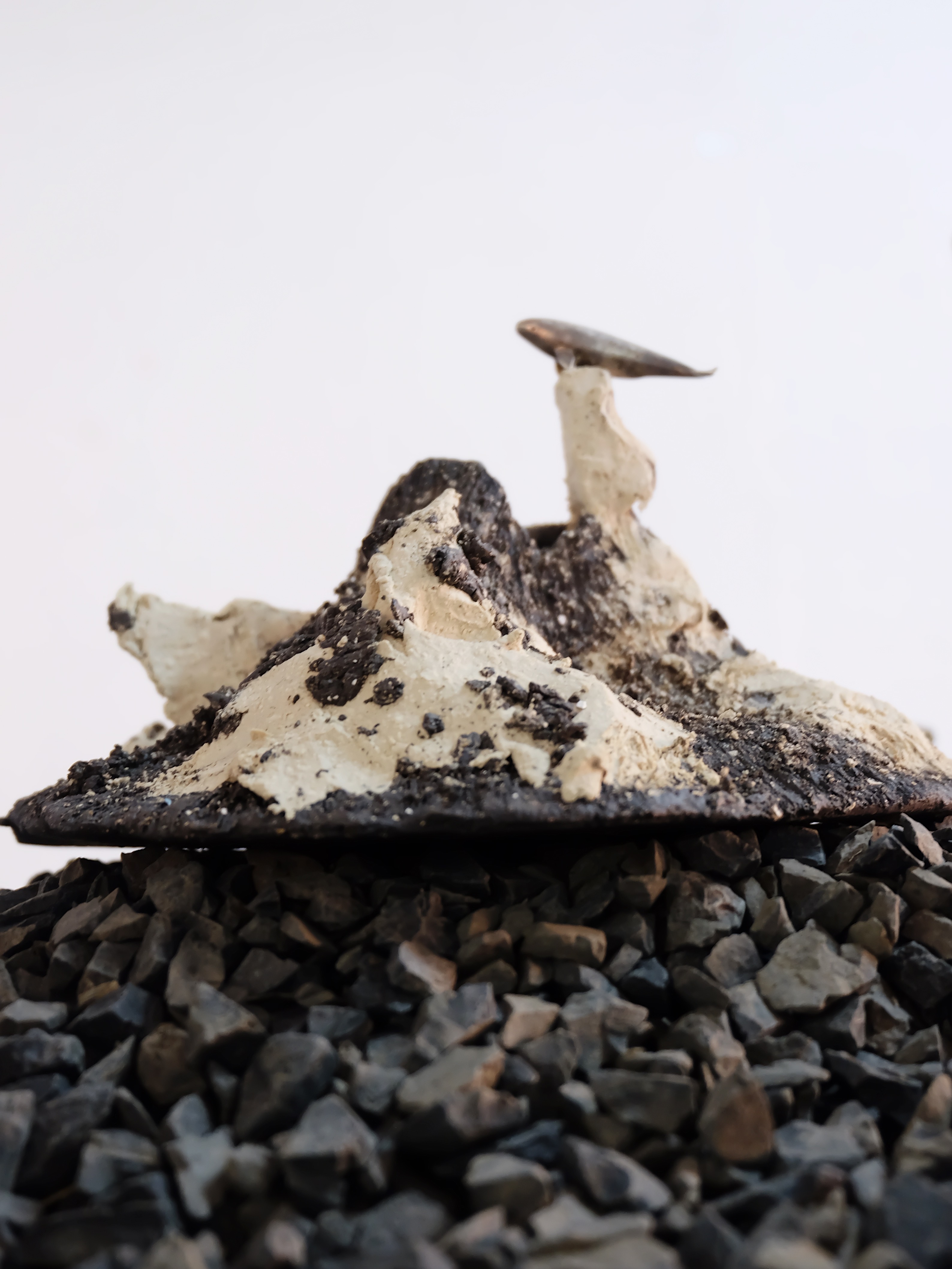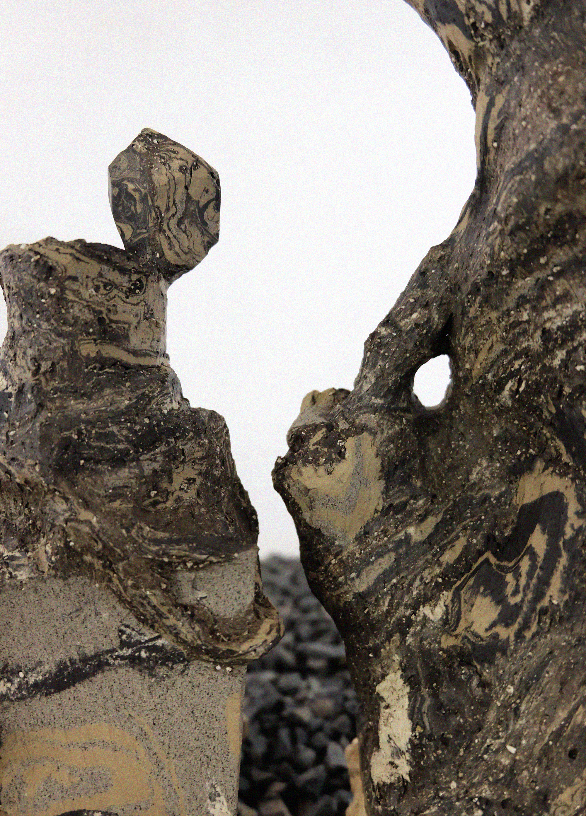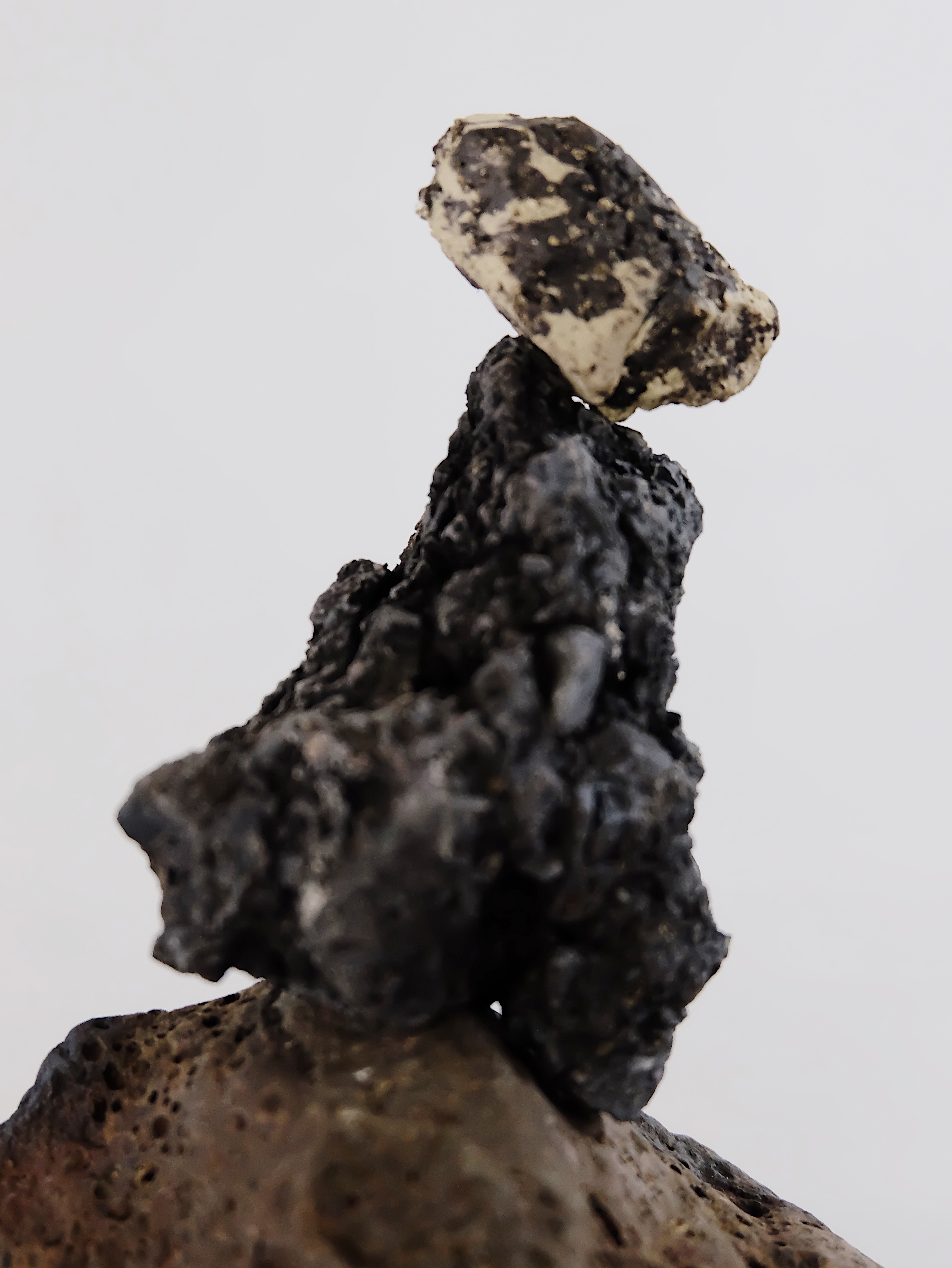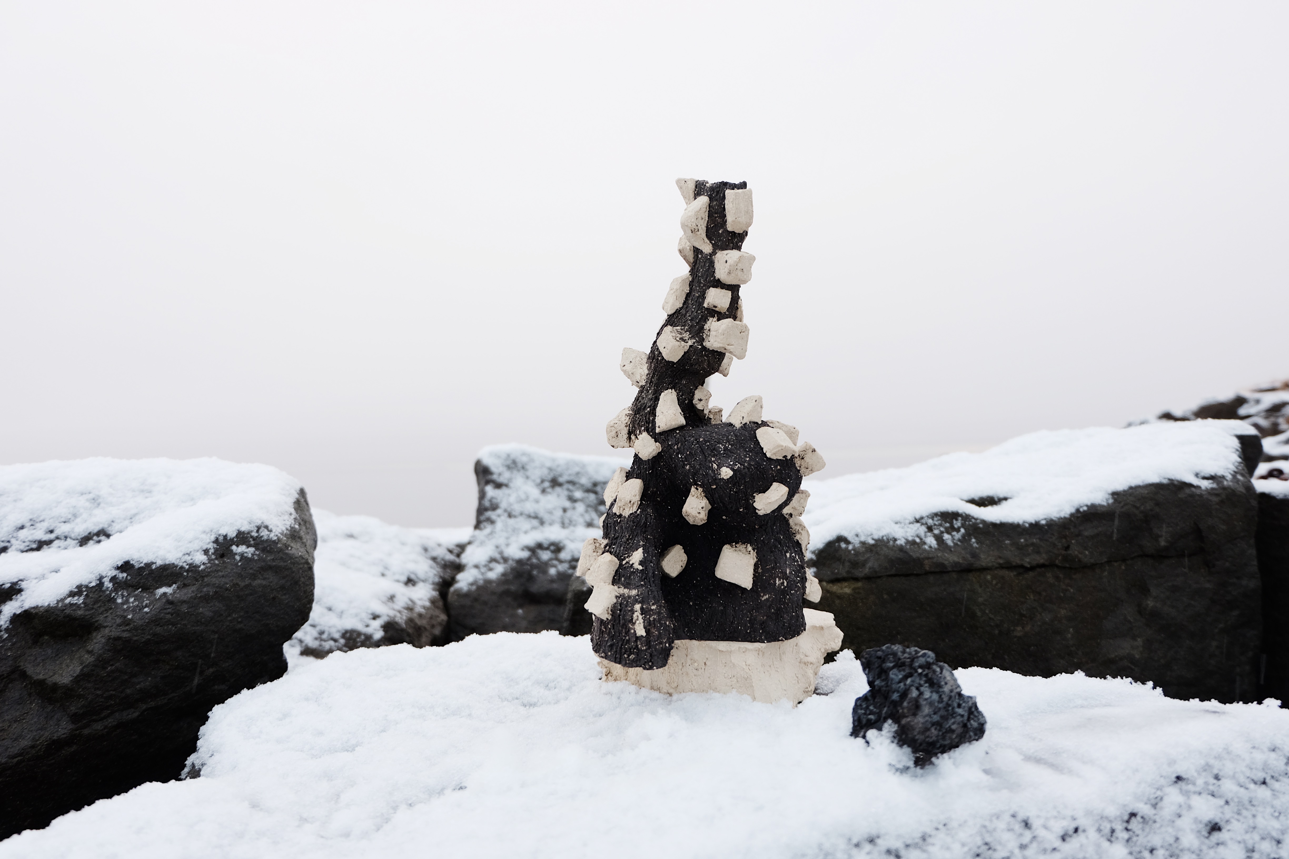 I fell into the magical trap of the icy landscape, the romantic moment of the soft white blanket covering the rugged black volcanoes. These thoughts led me to create these pieces using black and white stone clay to imitate the snowy black sand landscape under my feet—"The Snow Black".